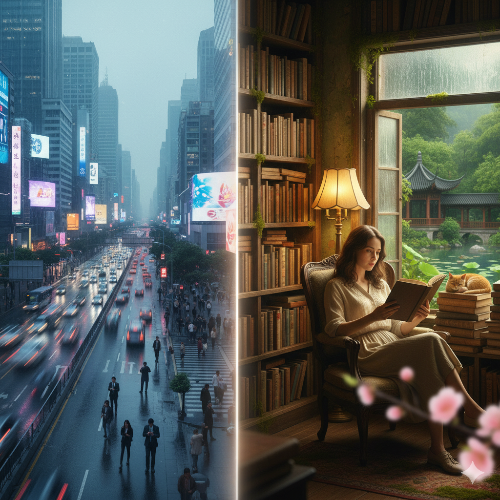 后来,我发现“桃花源”并非只存在于远离尘嚣的自然之中。它也可以存在于城市深处的一个老旧书店。那是一个被时间遗忘的角落,书架上堆满了泛黄的旧书,空气中弥漫着纸张与墨水的混合香气。每一次走进那里,我都能感受到一种久违的宁静与安详。我喜欢坐在靠窗的角落里,手捧一本心仪的书籍,让文字带我穿越时空,与智者对话,与历史相遇。在这里,我无需顾及外界的纷扰,只需沉浸在知识的海洋中,享受阅读带来的乐趣与启发。书店的猫咪慵懒地趴在书堆上,不时伸个懒腰,那种从容与自在,也仿佛在提醒我,生活可以不必那么匆忙。